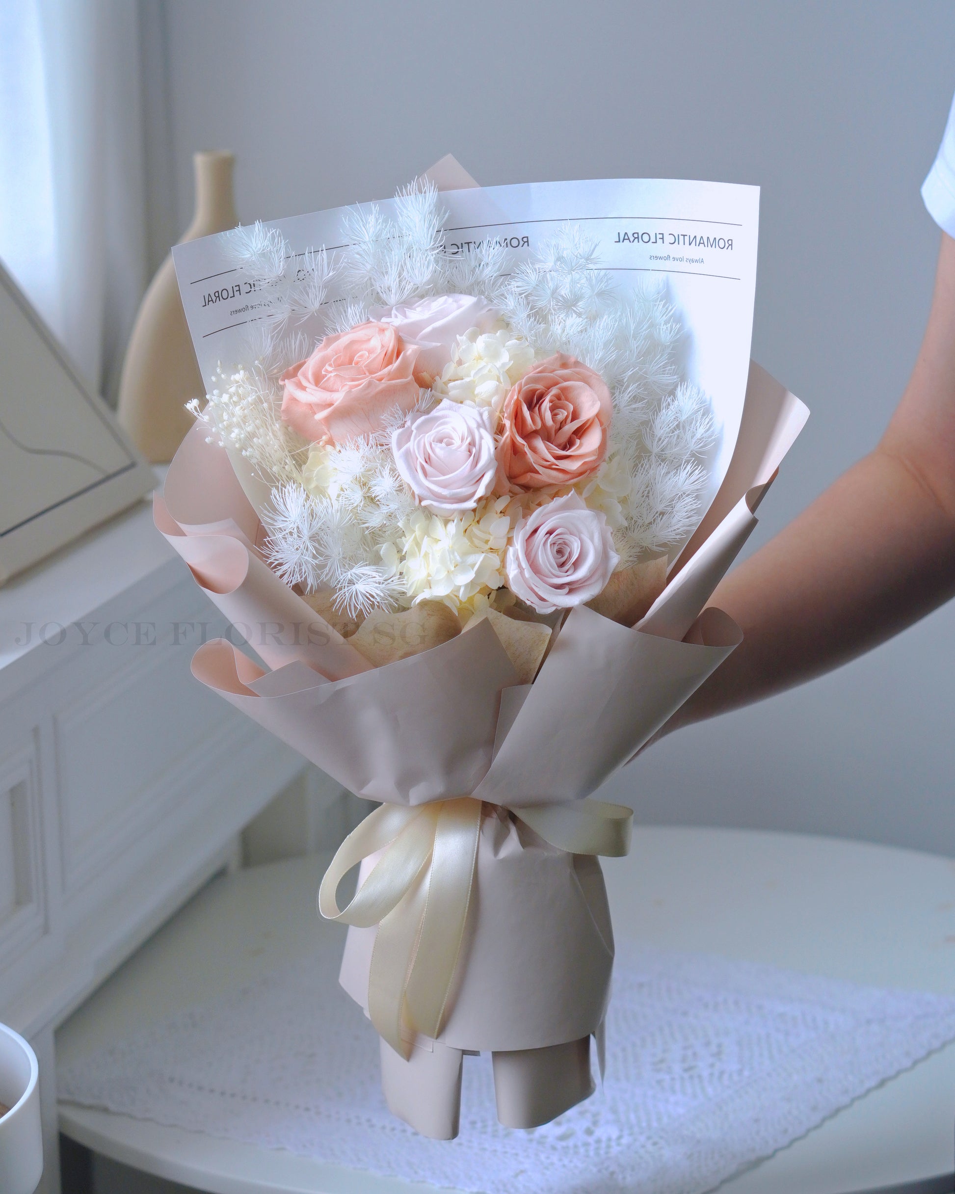 The beautiful flower arrangement is made with preserved roses and assorted dried flowers. No maintenance needed. Each dome comes with a nice gift box and paper bag. Suitable for any occasions, birthday, new born, etc. The whole arrangement is about 30cm tall and 20cm wide