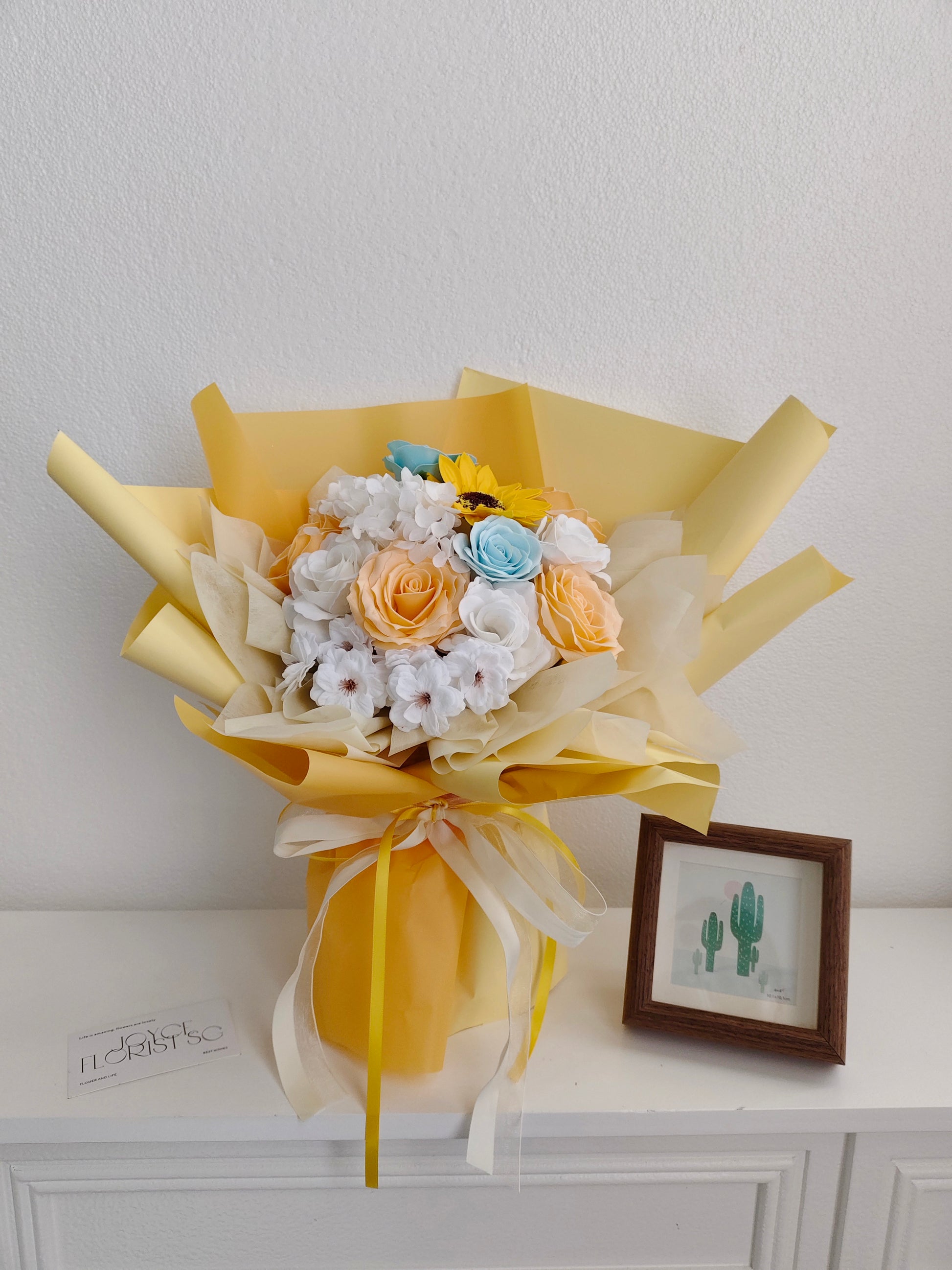 The beautiful flower bouquet is made with soap roses. No maintenance needed. Suitable for any occasions, Valentine's Day, birthday, new born, etc. The whole arrangement is about 45cm tall